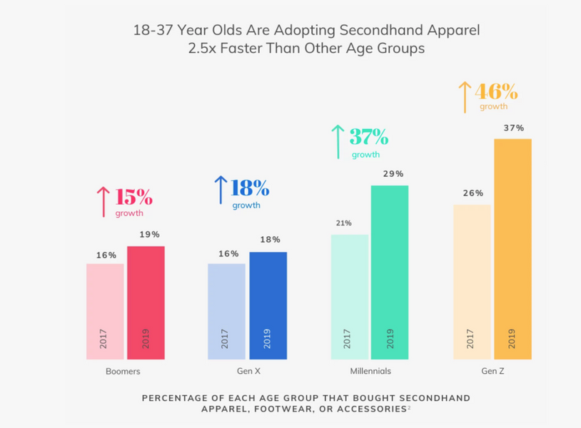Grunnen til dette er at begge målgruppene har størst vekst i kjøp av bruktklær og kjøper generelt mere klær på online (https://www.thredup.com/resale?tswc_redir=true)